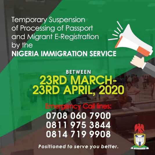 The Nigeria Immigration Service (NIS) wishes to inform the general public of the Temporary Suspension of Passport Processing and Migrant e-Registration Services from the 23rd March to 23rd April 2020.