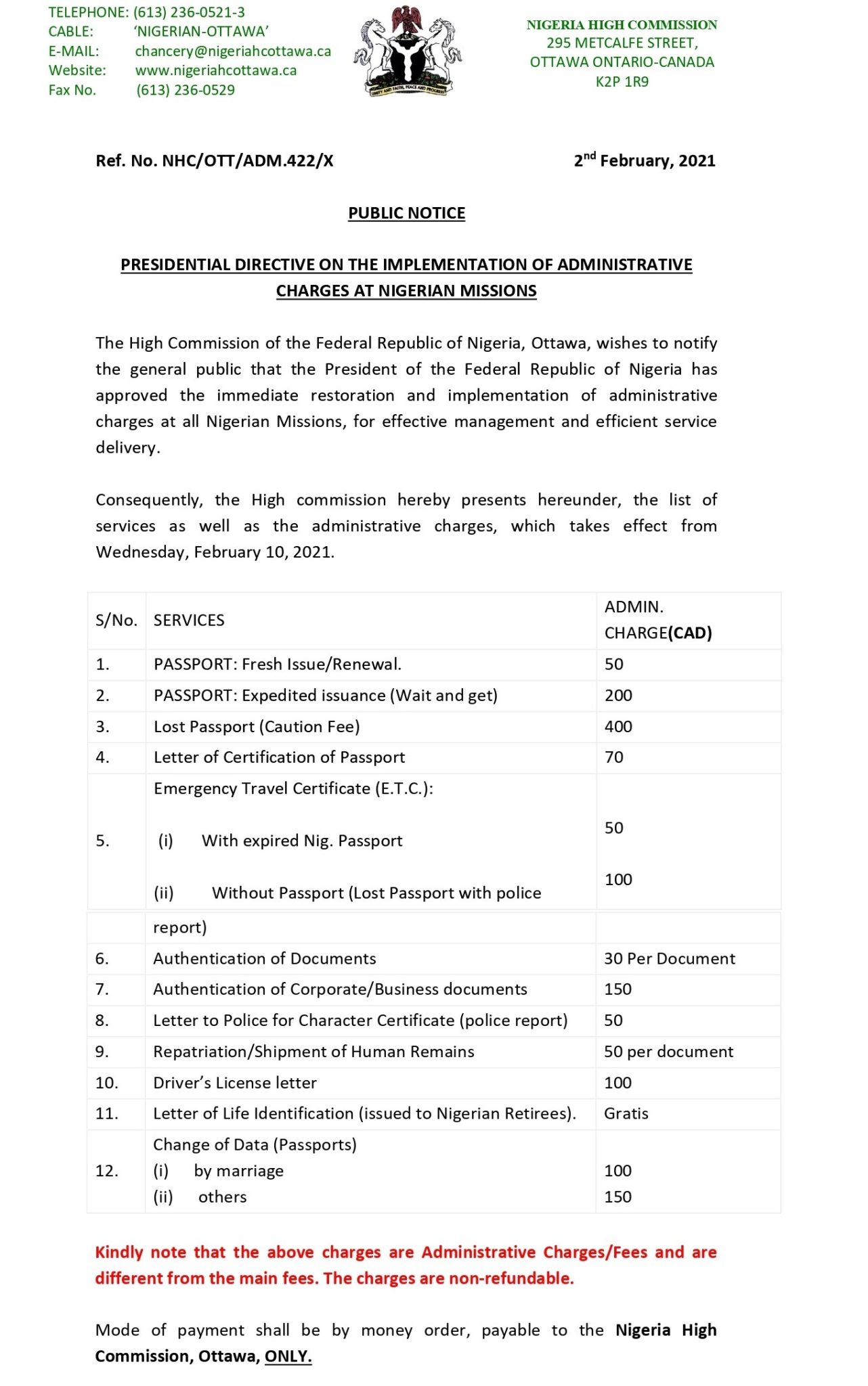 The High Commission of the Federal Republic of Nigeria, Ottawa, wishes to notify the general public that the President of the Federal Republic of Nigeria has approved the immediate restoration and implementation of administrative charges at all Nigerian Missions, for effective management and efficient service delivery.