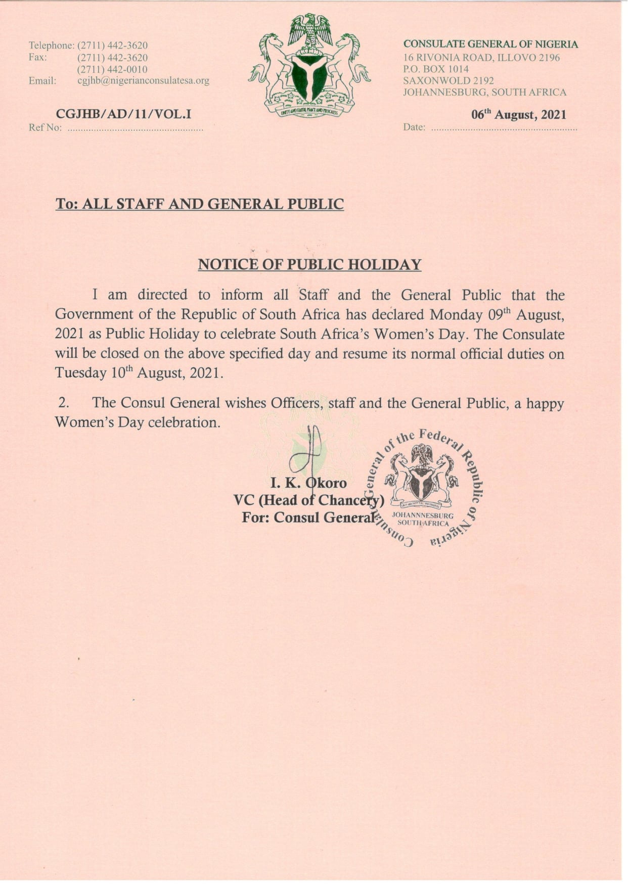 I am directed to inform all Staff and the General Public that the Government of the Republic of South Africa has declared Monday 9th August, 2021 as a Public Holiday to celebrate South Africa's Women's Day. The Consulate will be closed on the above specified day and resume its normal official duties on Tuesday 10th August, 2021.