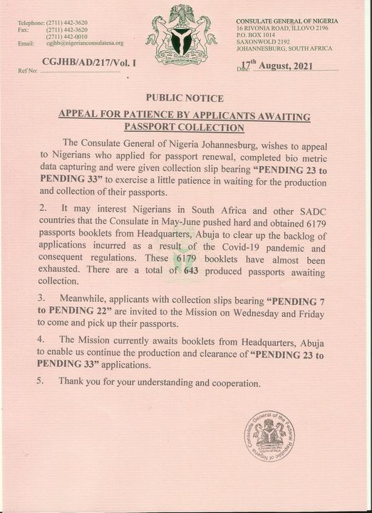 The Consulate General of Nigeria Johannesburg, wishes to appeal to Nigerians who applied for passport renewal, completed biometric data capturing and were given collection slip bearing "PENDING 23 to PENDING 33" to exercise a little patience in waiting for the production and collection of their passports.