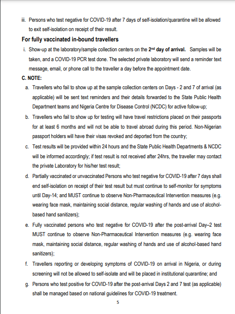 b. Travellers who fail to show up for testing will have travel restrictions placed on their passports for at least 6 months and will not be able to travel abroad during this period. Non-Nigerian passport holders will have their visas revoked and deported from the country;