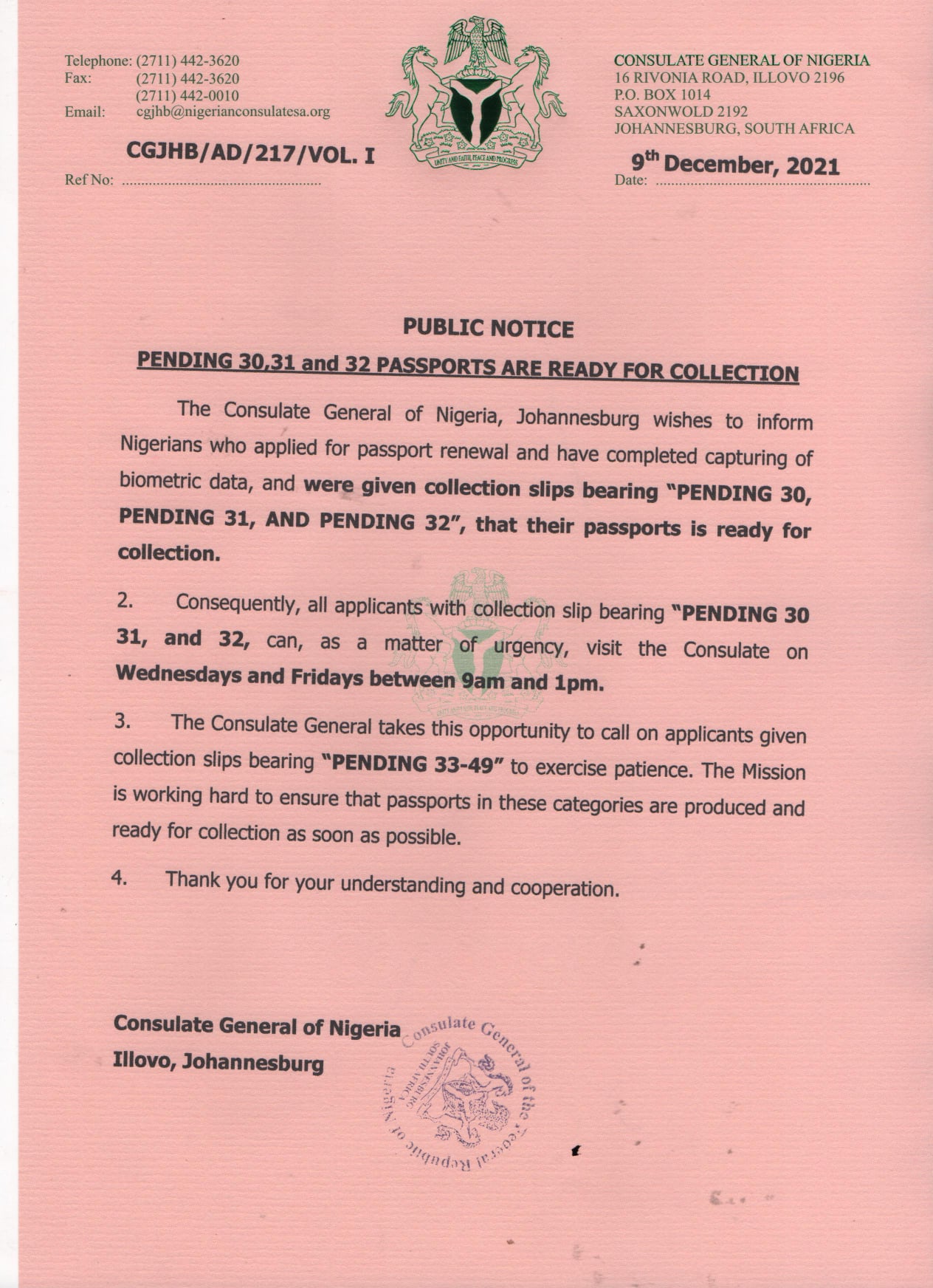 The Consulate General of Nigeria, Johannesburg wishes to inform Nigerians who applied for passport renewal and have completed capturing of biometric data, and were given collection slips bearing "PENDING 30", "PENDING 31" and "PENDING 32" that their passports are ready for collection.