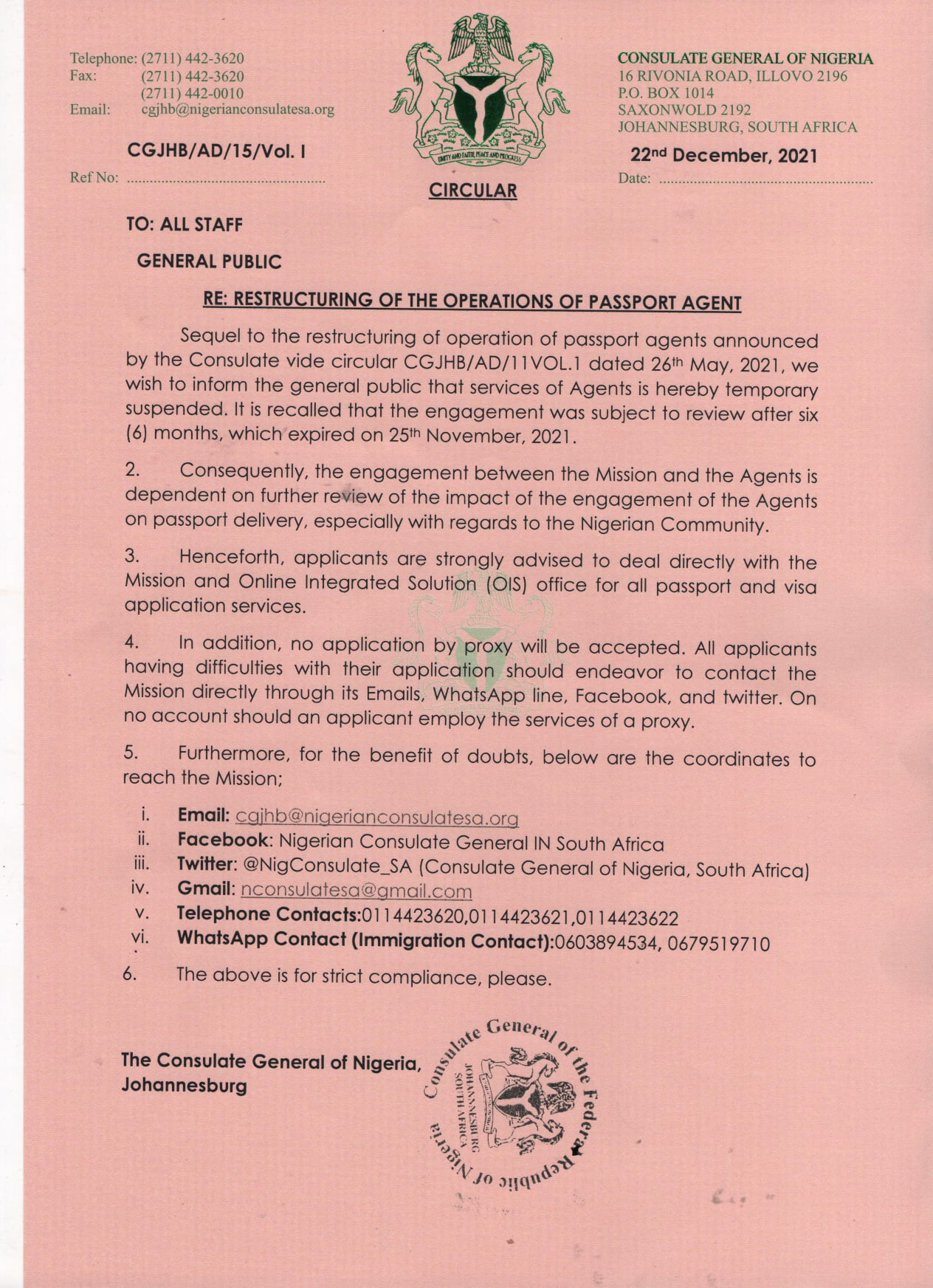 Sequel to the restructuring of operation of passport agents announced by the Consulate vide circular CGJHB/AD/11VOL.1 dated 26th May 2021, we wish to inform the general public that services of Agents is hereby temporarily suspended. It is recalled that the engagement was subject to review after six (6) months, which expired on 25th November, 2021.